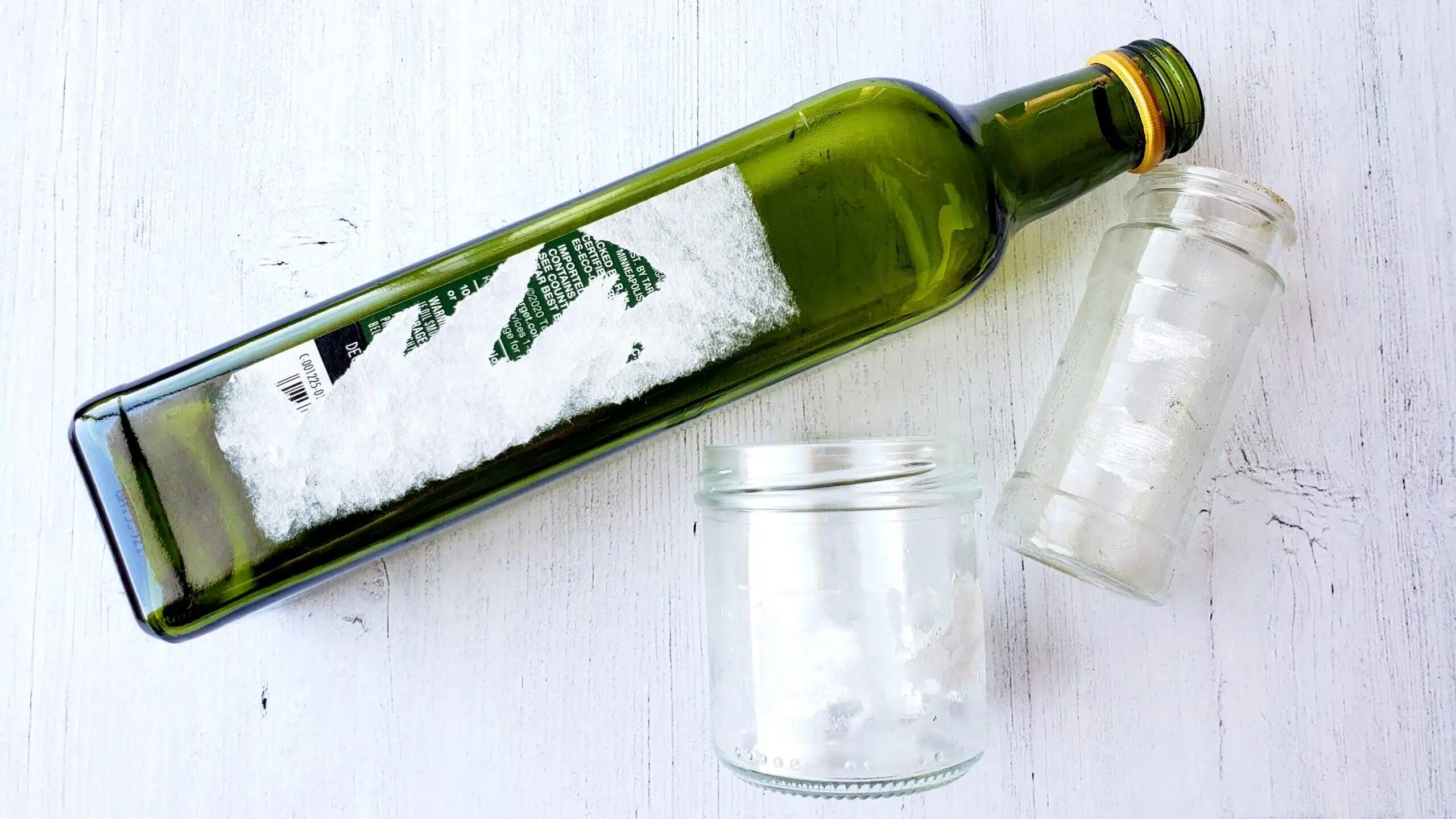 - Soak your containers in hot, soapy water until the label falls away and you can easily scrub off the softened glue with a firm sponge or dish brush. ⠀