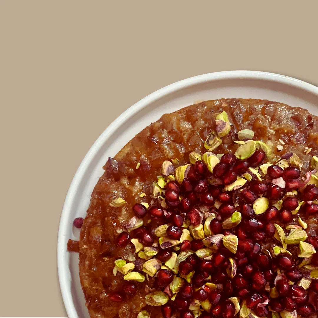 - Top the cake with roasted pistachios and pomegranate seeds and enjoy!