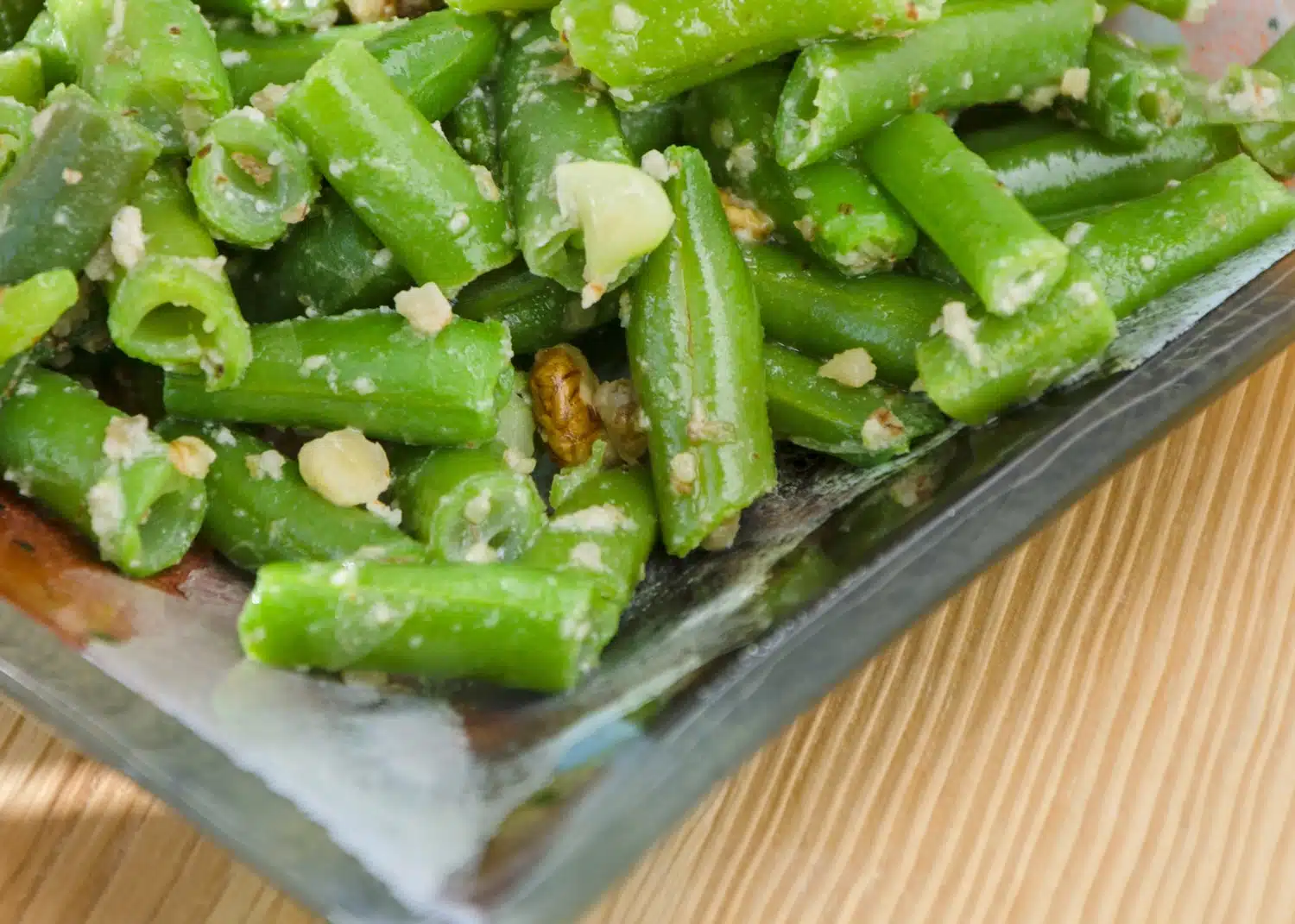 - In a large skillet, heat olive oil over medium heat. Add sliced onions and green beans and cook 3-5 minutes.