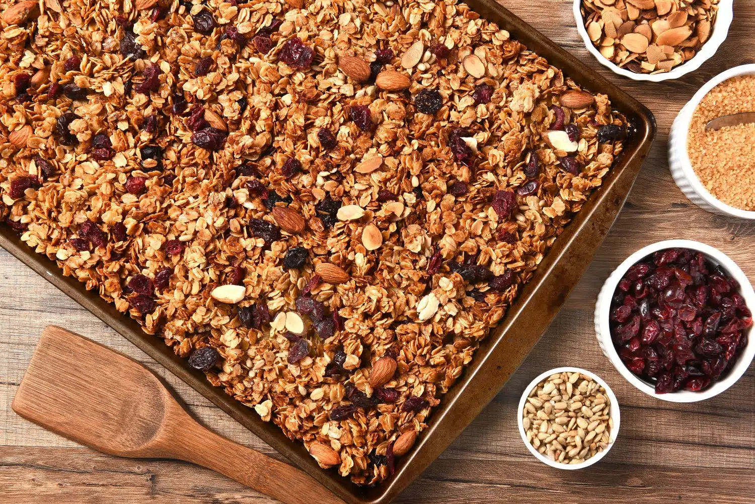 - Pour the granola onto a baking pan lined with a silicone mat or parchment paper. Spread granola in an even layer. Bake until golden, about 20 minutes, stirring halfway.