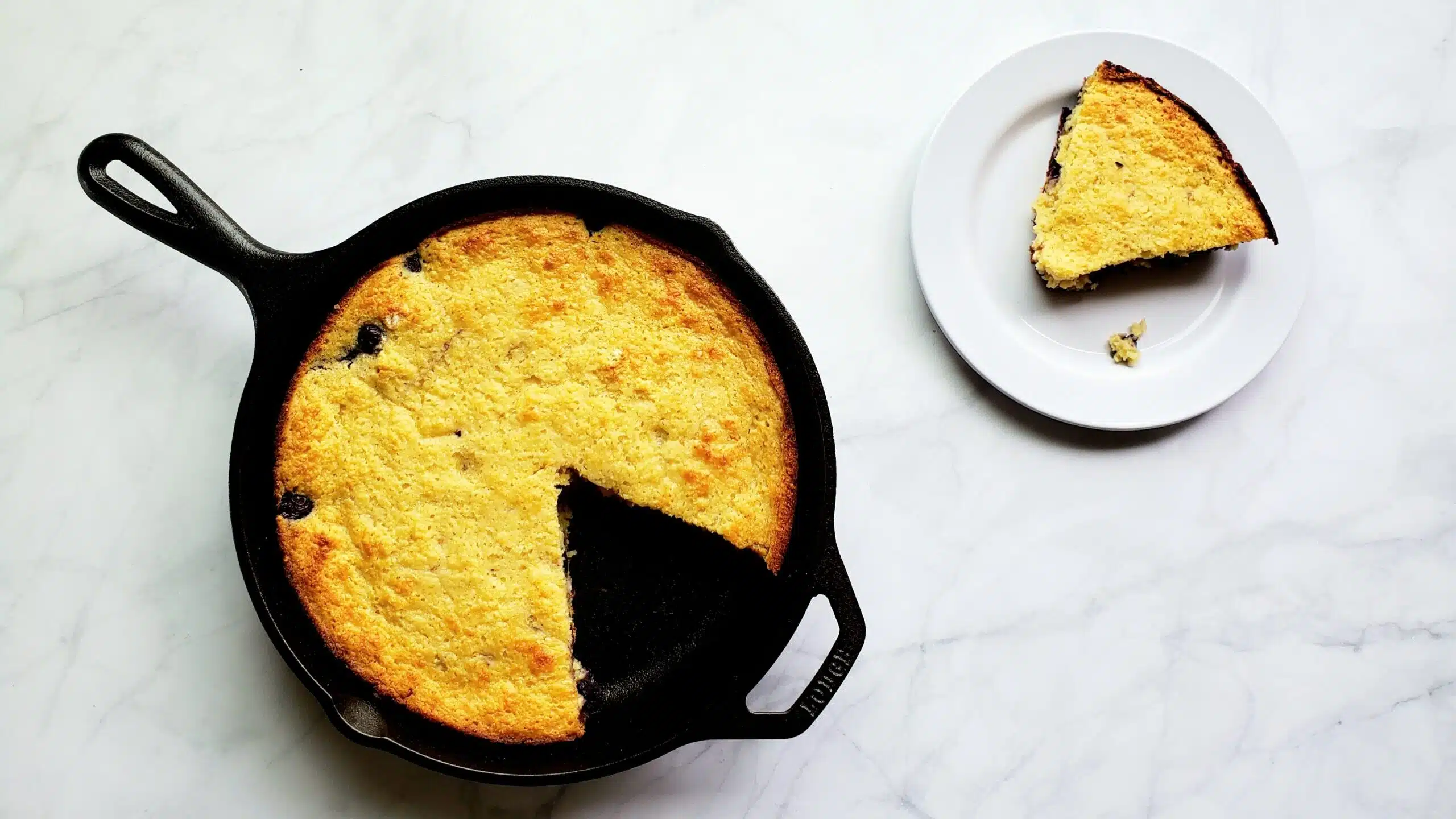- Pour the prepared cornbread batter into the skillet. Sprinkle the blueberries over the top, then gently push them down into the batter with your fingers.