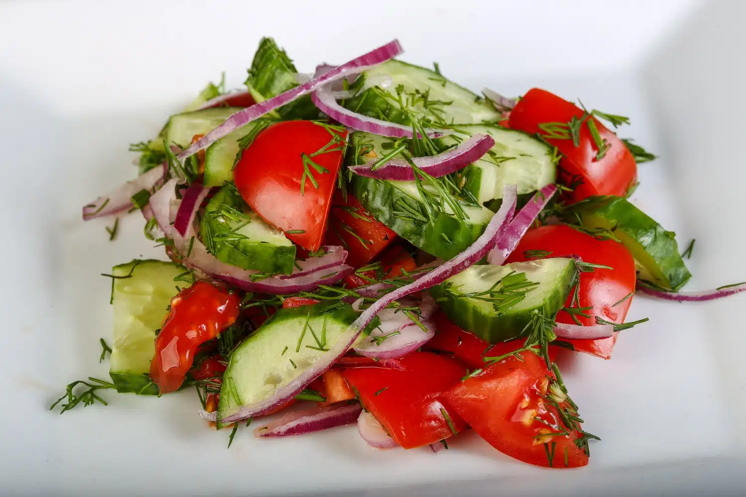 - In a large mixing bowl, gently toss the sliced cucumbers, tomato, and red onion with the dressing.