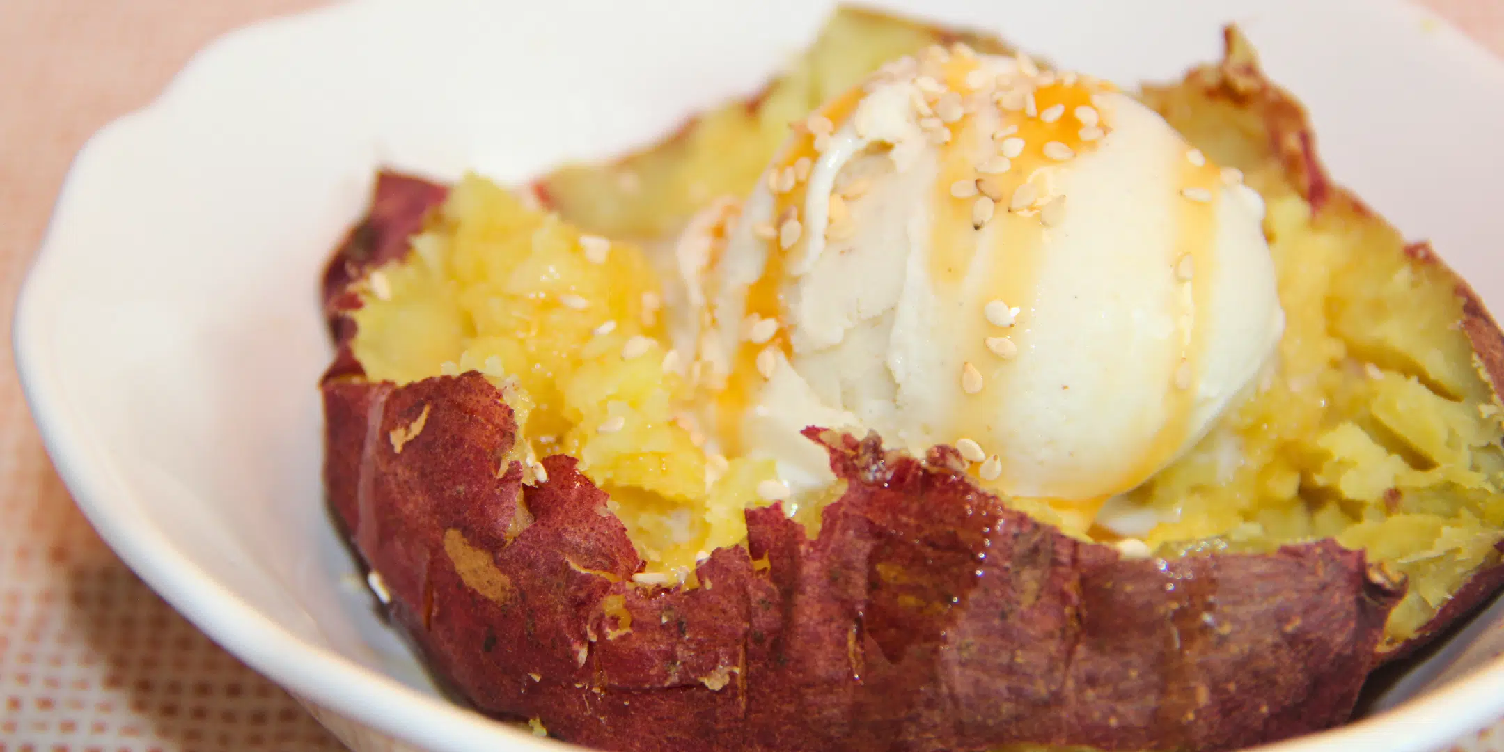 - Add a scoop of ice cream on top. Drizzle with caramel sauce and sprinkle with sesame seeds. Serve immediately.